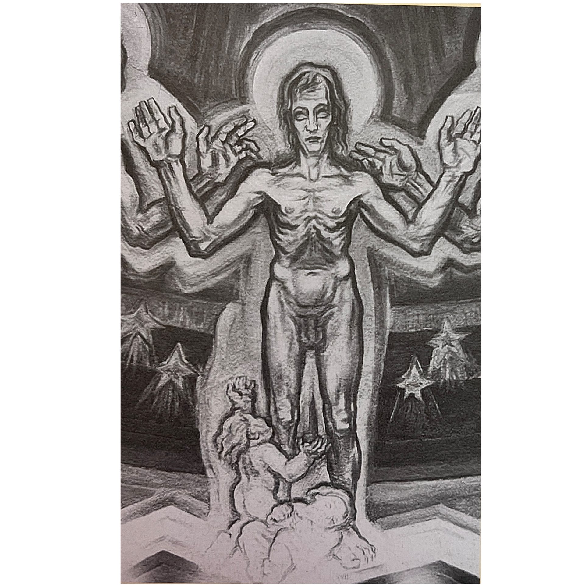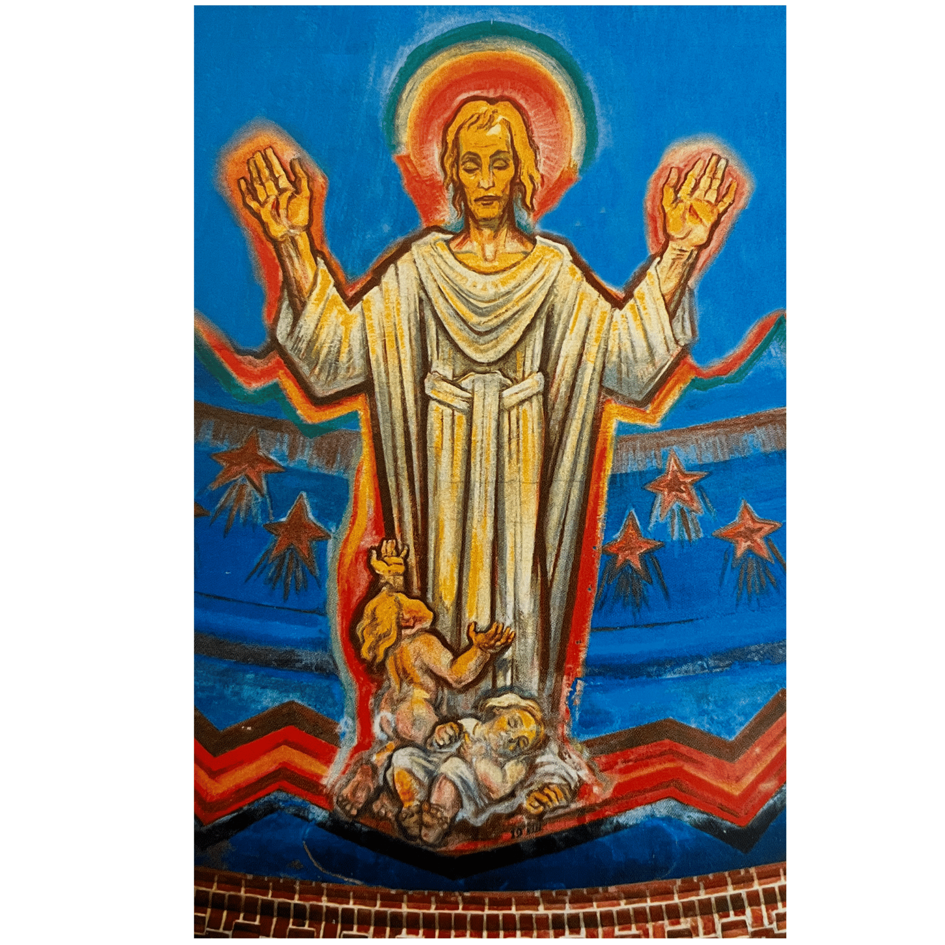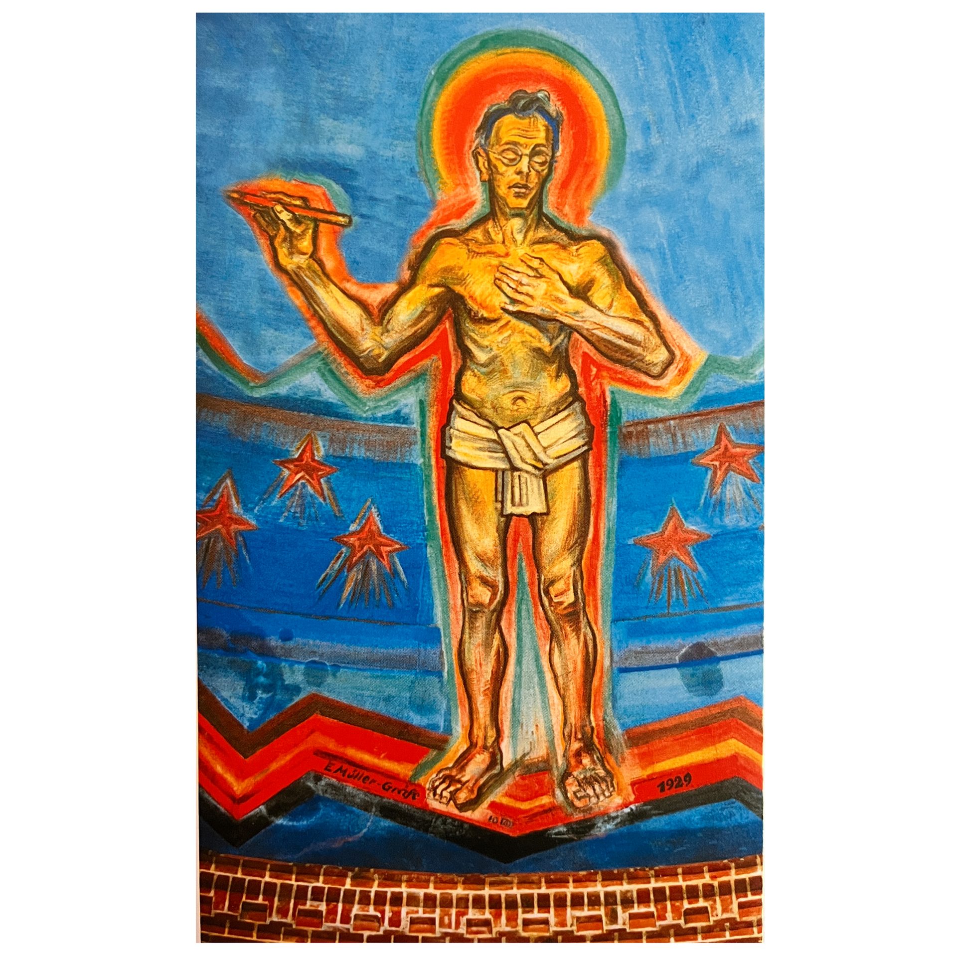 Sein bekanntestes Werk kannst du im Krematorium nebenan sehen: ein riesiges Deckenbild! Sechzehn große Figuren tanzen dort im Kreis um eine Sonne – Kinder, junge Leute, Erwachsene und Alte. Der Maler hat sich selbst mit Brille und Pinsel ins Bild gemalt.
